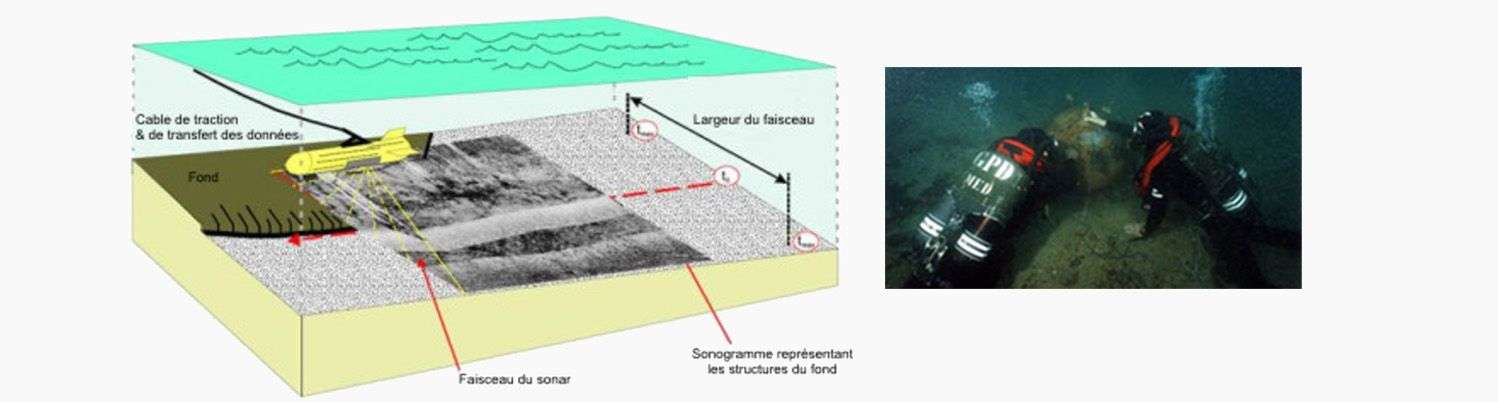 Après une phase d’étude bibliographique, la méthode de détection mise en œuvre est l’imagerie acoustique qui permet d’acquérir une image du fond marin qui pourrait être comparée à une image aérienne en niveaux de gris. La technique qui est au service de cette méthode consiste à parcourir la zone de recherche à bord d’un bateau qui tracte un appareil immergé dans la colonne d’eau. Cet appareil, appelé sonar à balayage latéral (SBL), crée une impulsion ultrasonique en forme d’éventail pour illuminer une ligne du fond perpendiculaire au sens d’avancement du bateau de mesure.