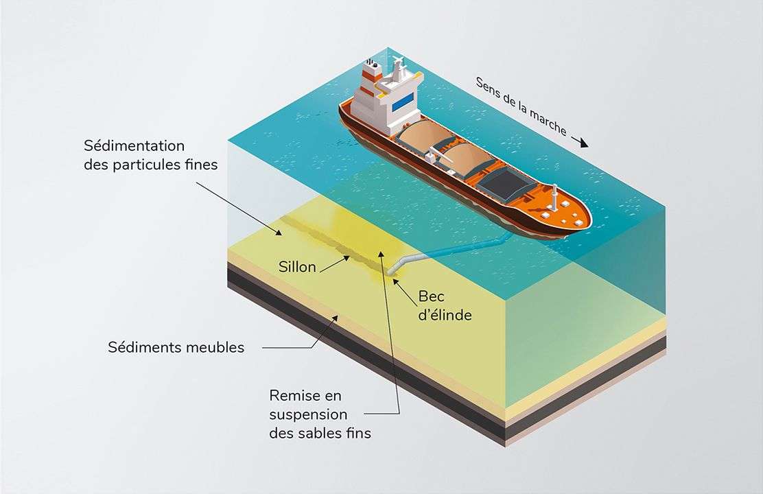 Le mélange de sédiments et d’eau issu de l’élinde décante dans la cale du navire. Les particules les plus fines restées en suspension sont évacuées avec le surplus d’eau en fonction du type de navires par :