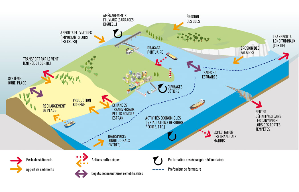 Le « trait de côte » correspond à l’interface entre la terre, la mer et l’atmosphère. Il évolue naturellement et continuellement en fonction de sa nature intrinsèque (type de côte, disposition et résistance des roches, topographie de l’arrière-pays...) et sous l’effet de facteurs atmosphériques (vents, dépressions, précipitations, etc.) et hydrodynamiques (niveau marin, vagues, courants associés, débits des fleuves). Son équilibre dépend des flux sédimentaires et s’exprime par le bilan établi entre, d’une part, les apports marins et fluviatiles et la production biogène (maërl, sable coquillier), et d’autre part les pertes en mer et à terre (extractions, dragages, ouvrages bloquant le transit sédimentaire...). Ce bilan s’évalue au sein d’une « cellule hydrosédimentaire », compartiment littoral regroupant la majorité des échanges sédimentaires de manière globalement indépendante des compartiments adjacents.